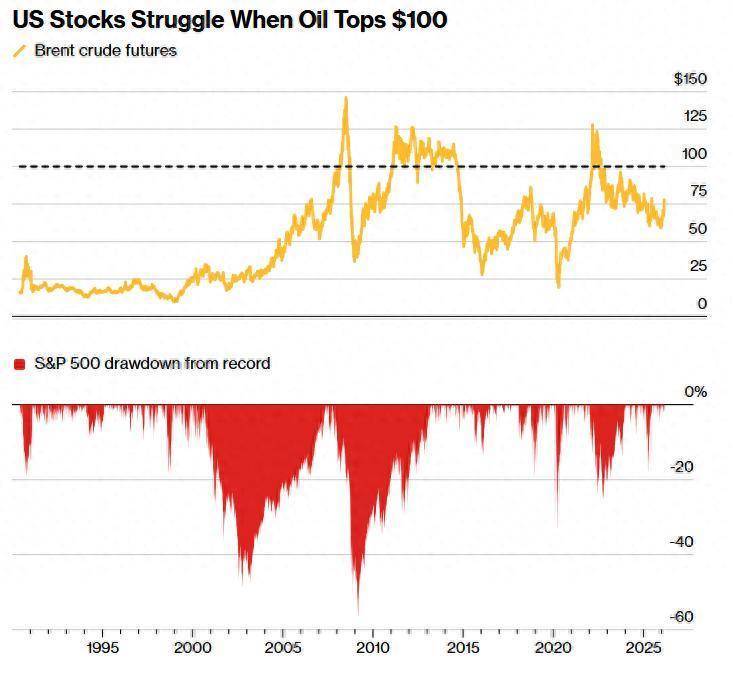 Bloomberg Intelligence政策师团队暗意,从历史上看,唯有当油价升至每桶100好意思元以上时,股票市集才的确会受到困扰。政策师们补充称,自1983年以来,在油价高于每桶100好意思元的时期之后一年内,标普500指数平均下落1.6%;他们提到,若是霍尔木兹海峡始终关闭输送,一些华尔街分析师已将这一价位纳入猜度模子。