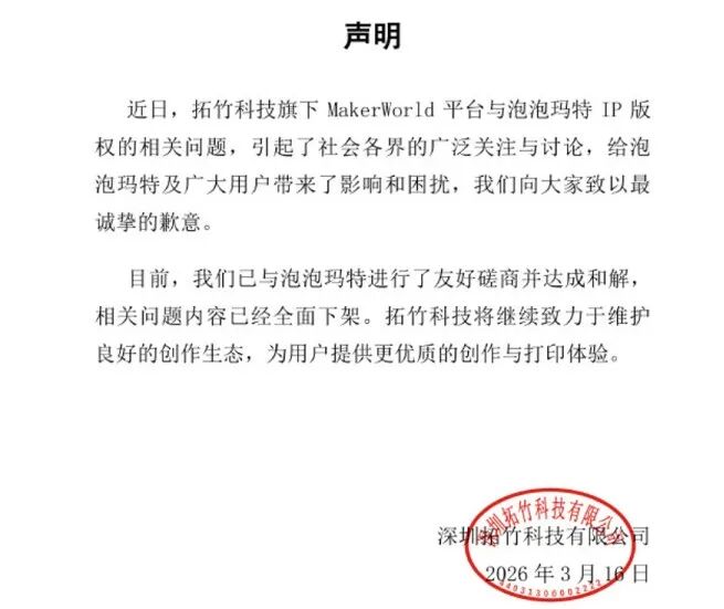 深圳拓竹科技有限公司(以下简称“拓竹科技”)3月16日发布公告称,拓竹科技旗下MakerWorld平台与泡泡玛特IP版权的联系问题,引起了社会各界的粗鲁柔软与磋商。当今,公司已与泡泡玛特进行了友好权术并竣事息争,联系问题本色一经全面下架。