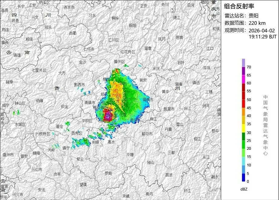 尤其是广东,有可能再次平庸出现暴风暴雨,最大雨量可达大暴雨,局部短时特大暴雨的可能性仍然存在。实质上,4月2日晚上,强对流也曾试探性出击,20点15分前后,一坨紫的发白的回波紧迫贵阳,当地出现了鸽子蛋大小的冰雹。
