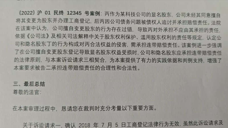 在北京市通州区东说念主民法院民一庭副庭长郑吉喆法官审理的一都商事纠纷案件中,原告代理东说念主为了进一步佐证其不雅点,庭后向法院提交的书面意见中,征引了上海一中院的(2022)沪01民终12345号案件。