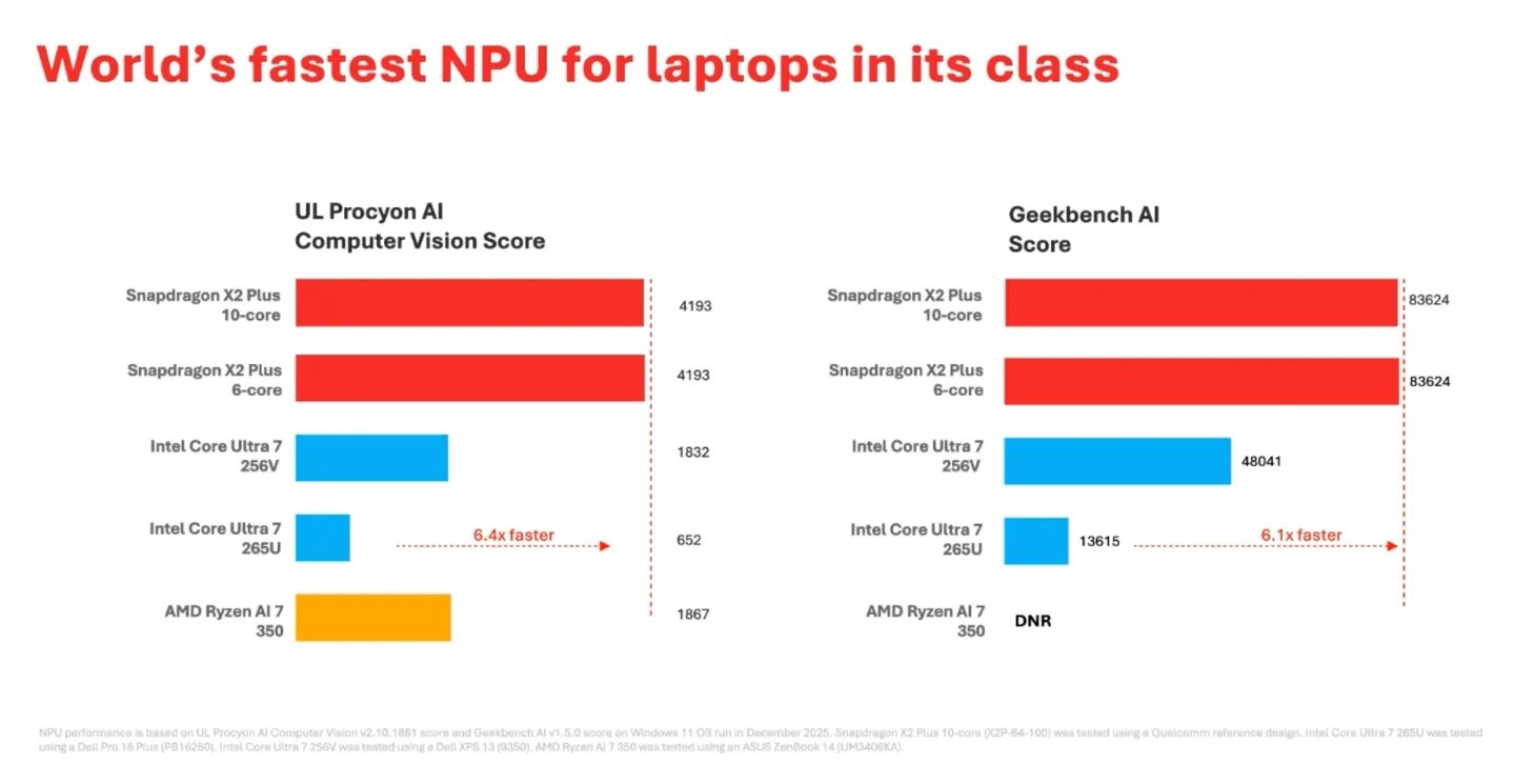 在 AI 任务方面,X2 Plus 依然配备了与高端型号换取的80 TOPS 神经网罗处置单位。高通声称,这使其成为“同级别条记本中公共最快的 NPU”。